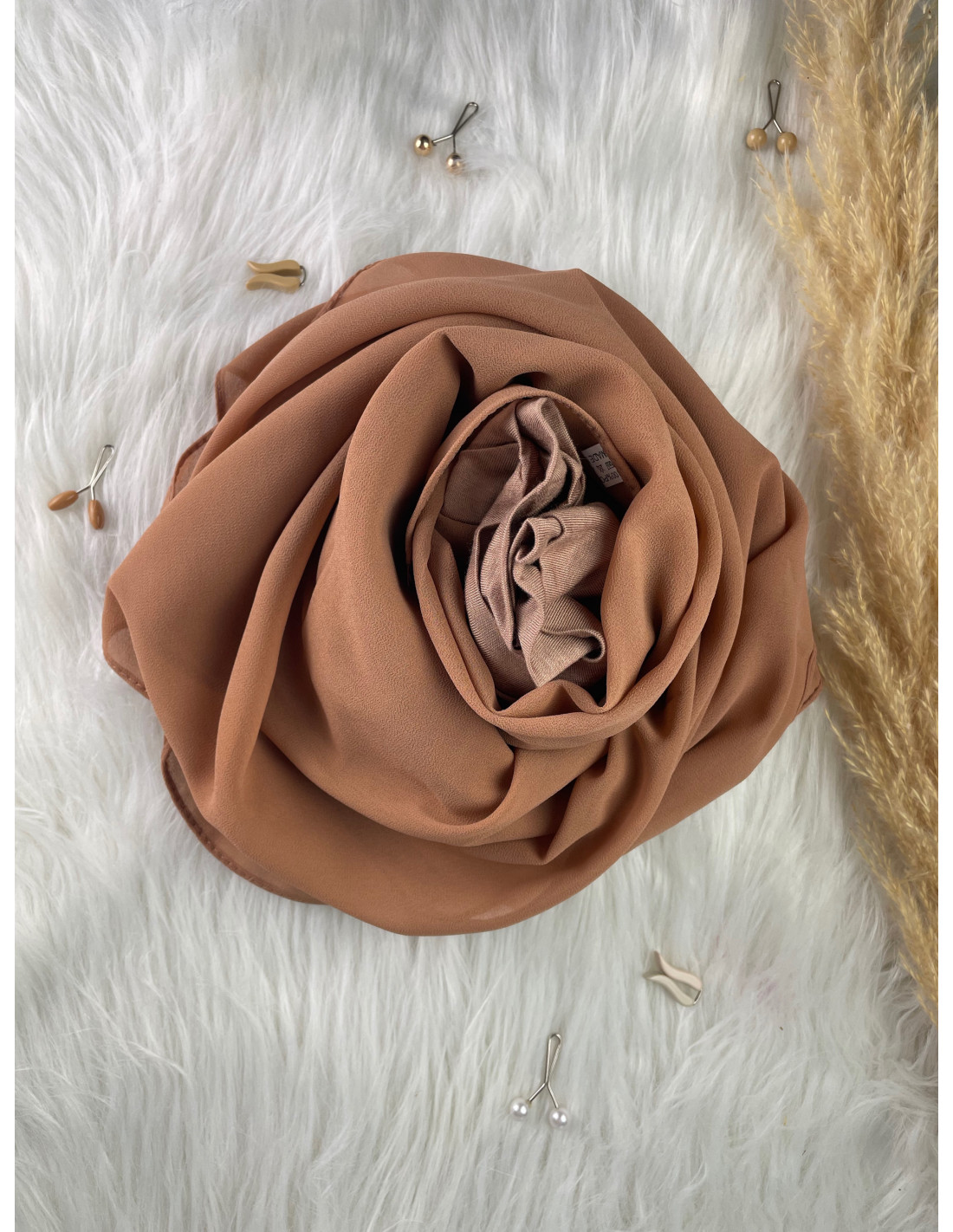 Ce hijab à enfiler se compose d'un bonnet fermé croisé en viscose et de son châle en mousseline cousu sur le dessus.